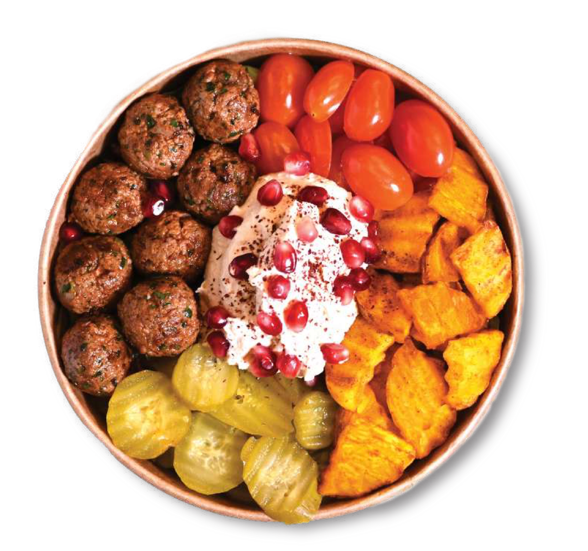 Une base de salade croquante nappée de notre sauce maison, avec une touche de salade de persil et sumac, des tomates cerises, des potatoes wedges, des cornichons, du houmous crémeux et de délicieuses boulettes de kafta grillées.