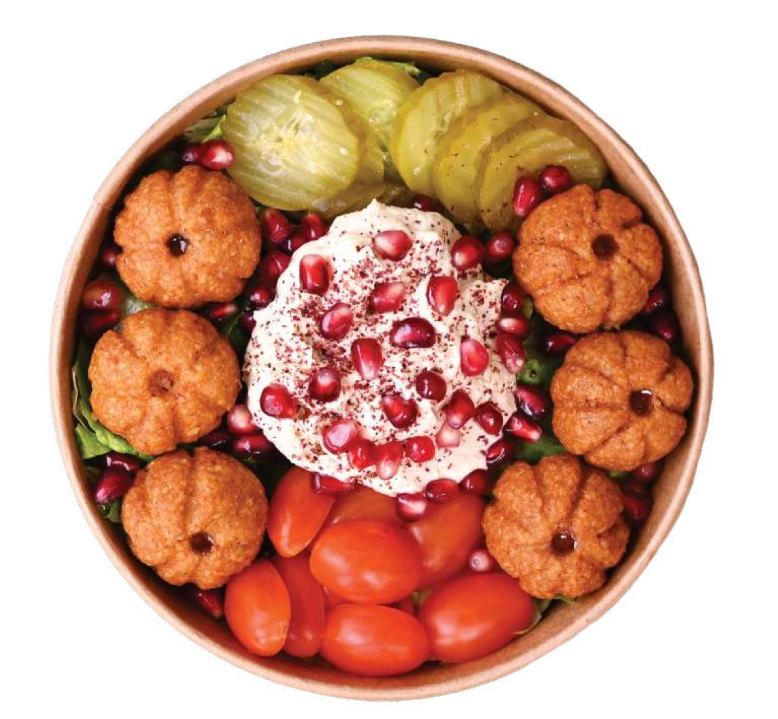 Une base de salade croquante accompagnée de notre sauce maison, avec du Kibbe meqlie, du houmous crémeux, des potatoes wedges, des tomates cerises et des cornichons.