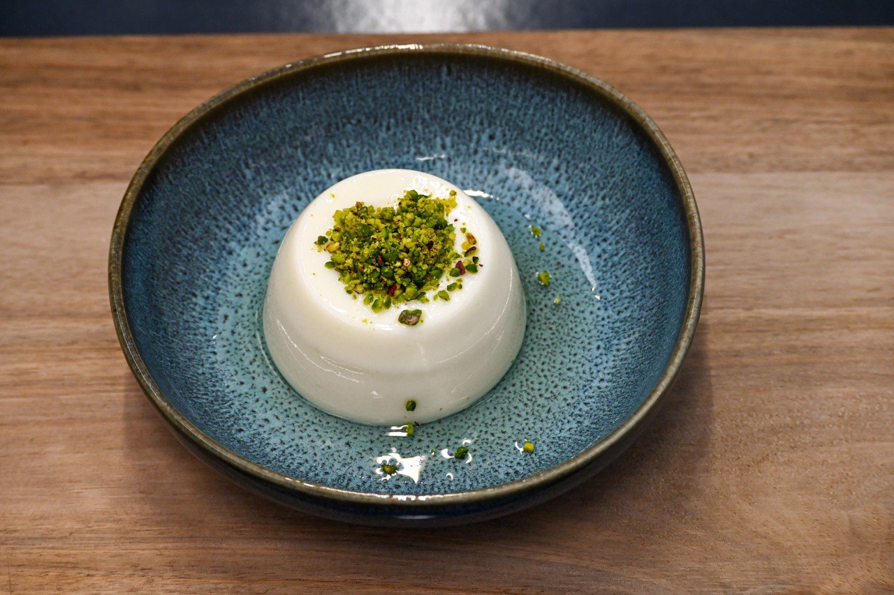 Flan libanais au lait parfumé à la fleur d'oranger et garni de pistaches.