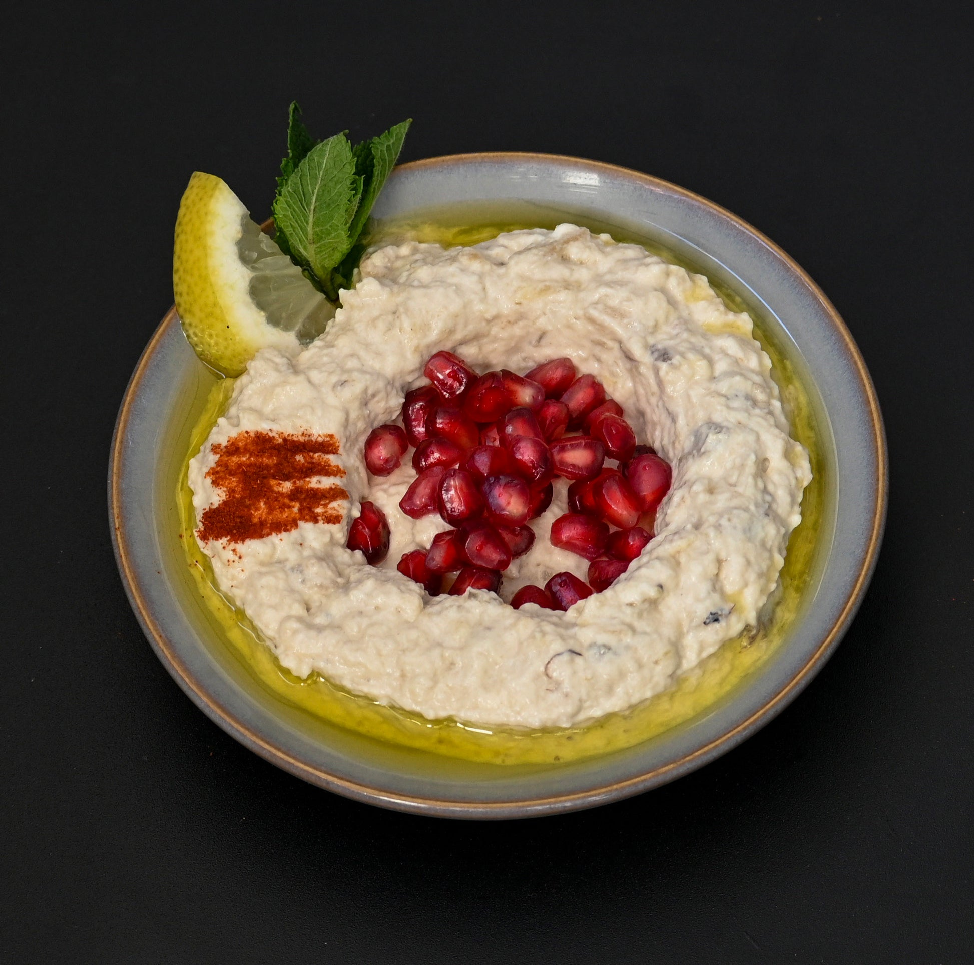 Purée d’aubergines grillées, tahini, citron et ail.