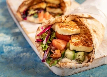 Tranches de halloumi grillées à la perfection, associées à des légumes frais et une sauce crémeuse, le tout roulé dans un pain libanais.